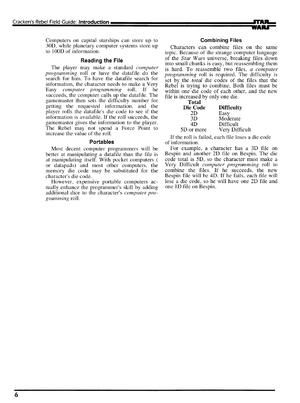 Characters can combine files on the same topic. Because of the strange computer language of the Star Wars universe, breaking files down into small chunks is easy, but reassembling them is hard. To reassemble two files, a computer programming roll is required. The difficulty is set by the total die codes of the files that the Rebel is trying to combine. Both files must be within one die code of each other, and the new file is increased by only one die.